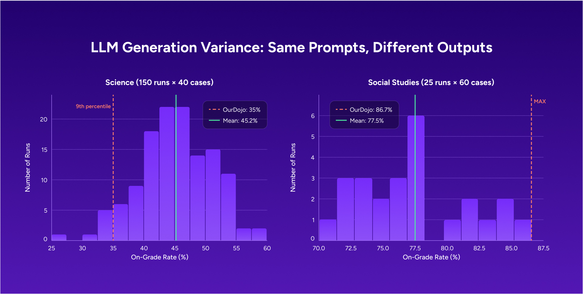 Testing across subjects, grade bands, tools, and prompt structures, with multiple runs for each condition, gives us a clearer view of how the system is performing.
