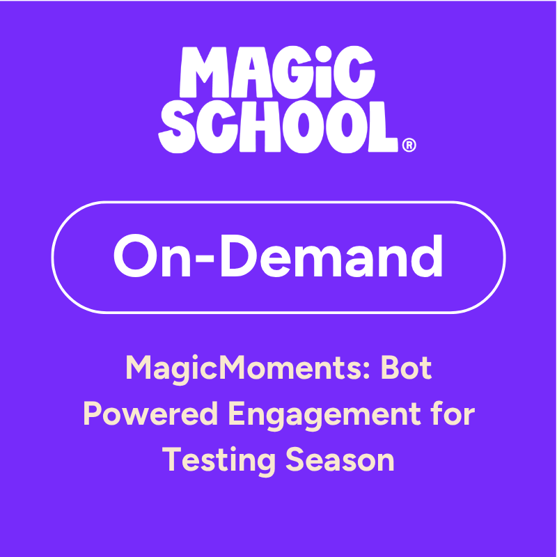 New webinar series. Less than 20 minutes. This MagicMoment focuses on keeping students engaged as we head into spring break and end-of-year testing season. In this session, MagicSchool Ambassador Teresa Upchurch shares custom bots and tools designed to boost classroom engagement and make review sessions actually work.